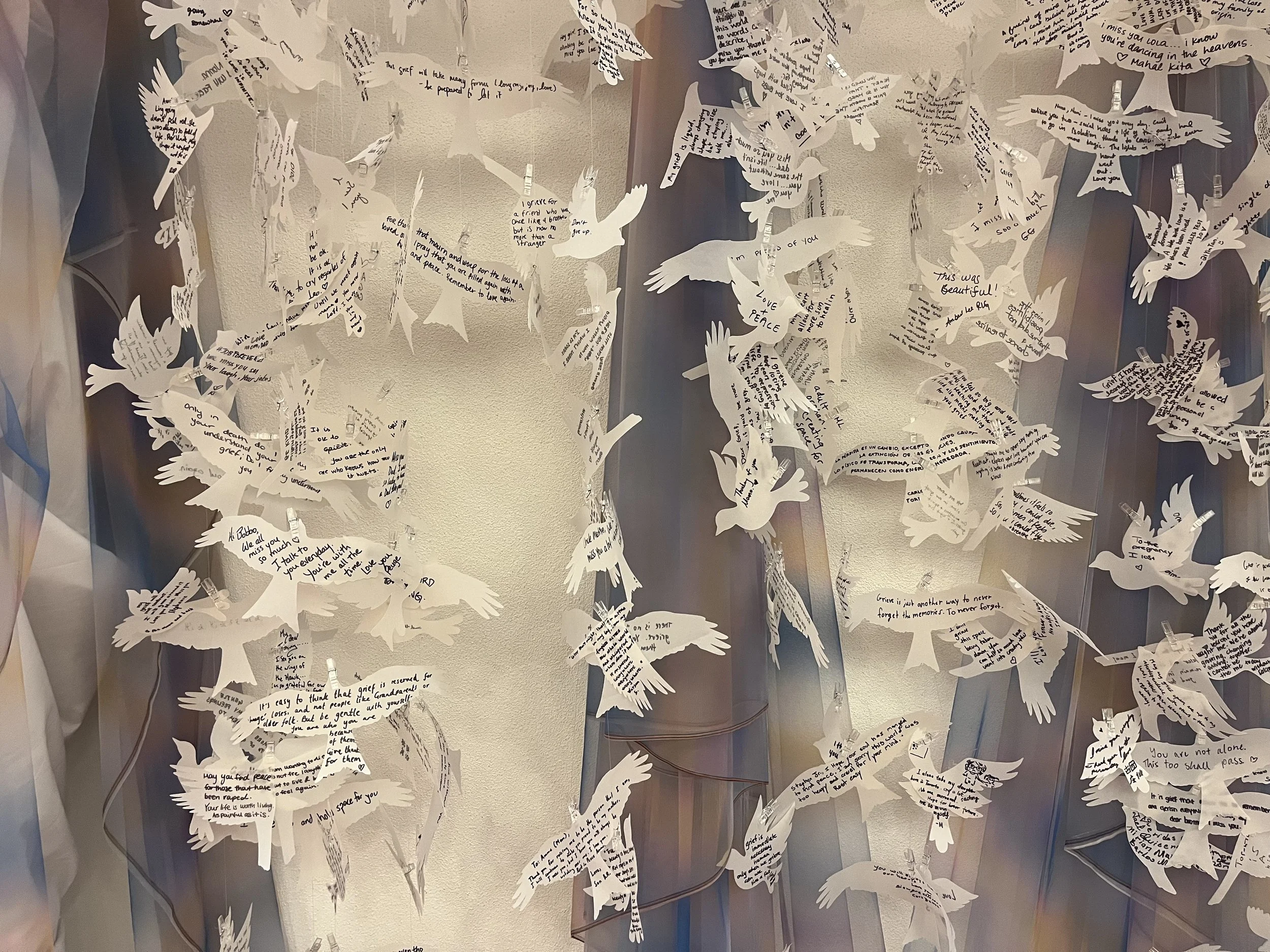 The experience ended with a final space: a wall of messages which hung on bird-shaped cutouts that held reflections from visitors on their experiences of and ideas on grief.